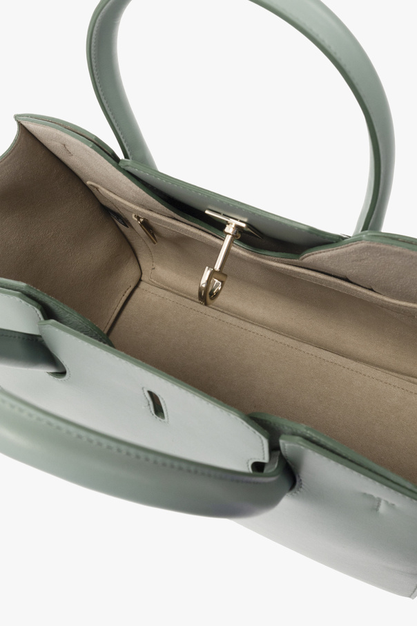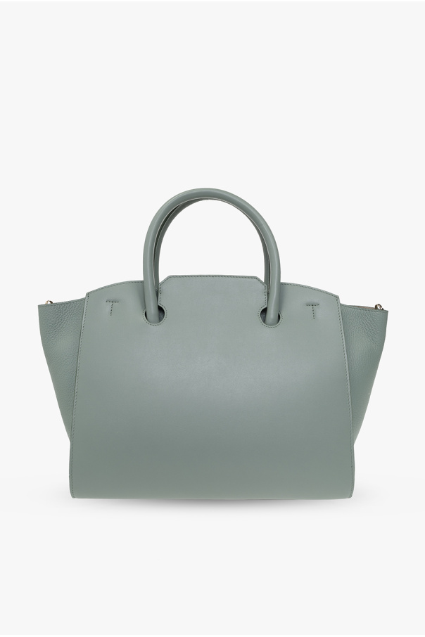 Green ‘Genesi Medium’ shopper bag from Furla. Crafted from smooth leather and grained leather, this design secures with a twist fastener and showcases a printed logo on the front, a detachable and adjustable shoulder strap, two half-round handles, gold-tone metal hardware and one internal compartment with one zip pocket and two slip pockets.
