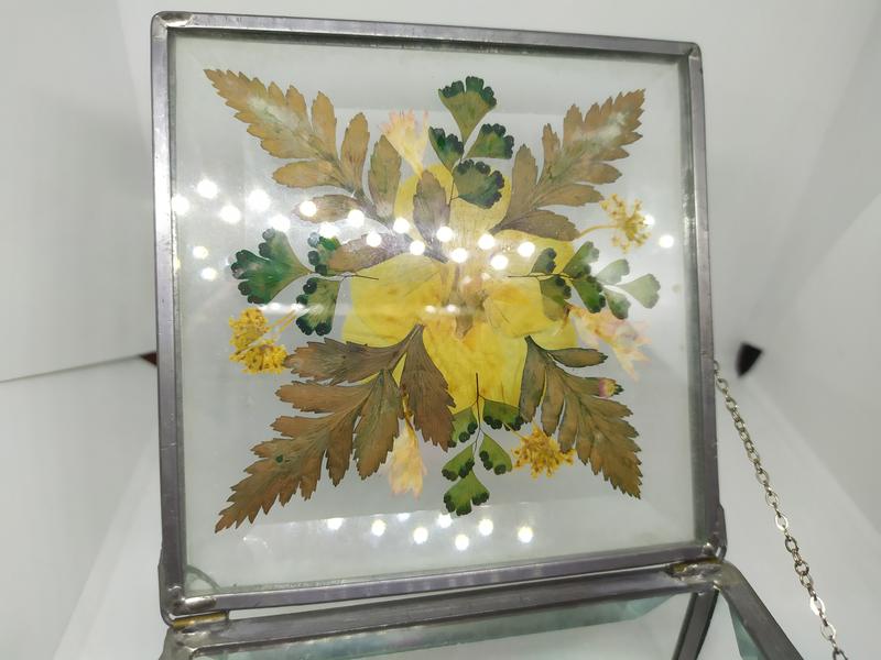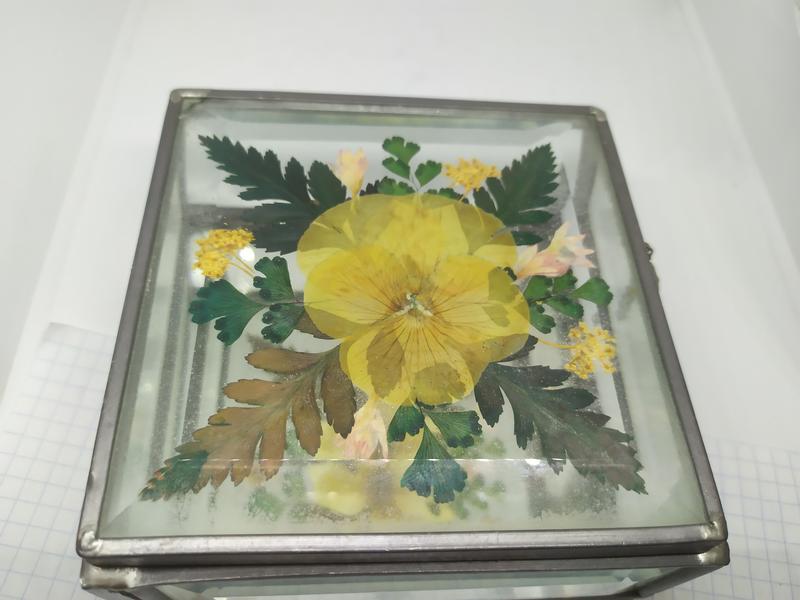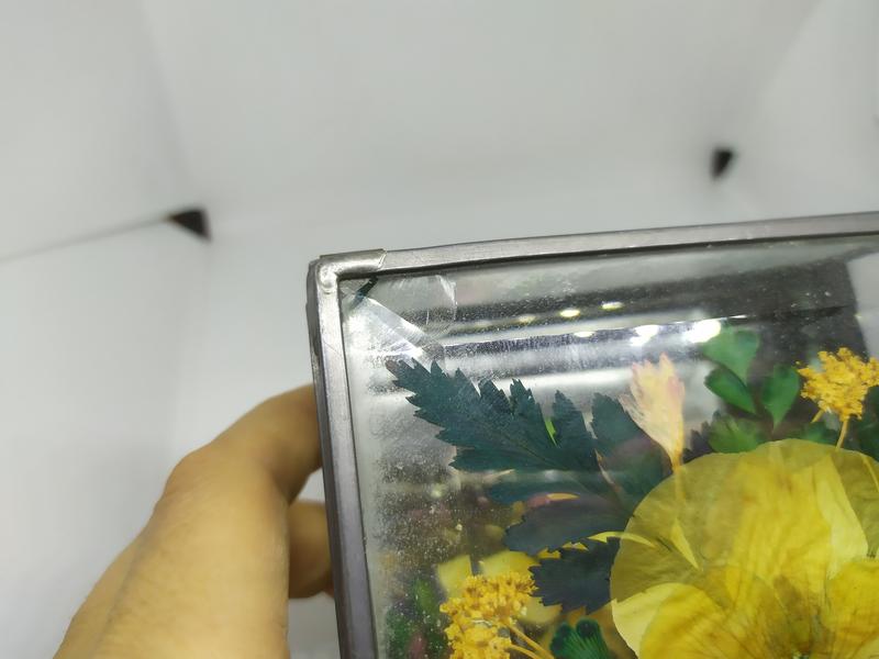 в крышке между двух стекол вставлены сухоцветы. И с внутренней стороны между двумя стеклами есть пластинчатый скол-на фото. Скорее всего он образовался при изготовлении.