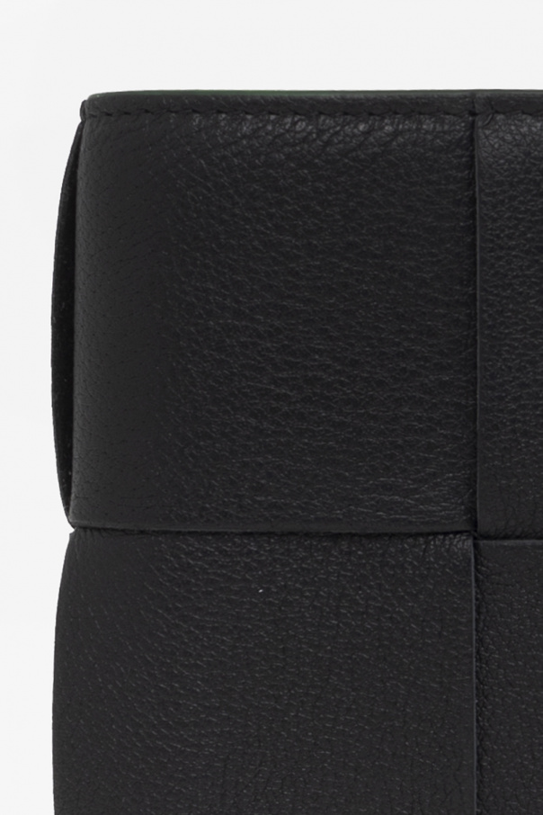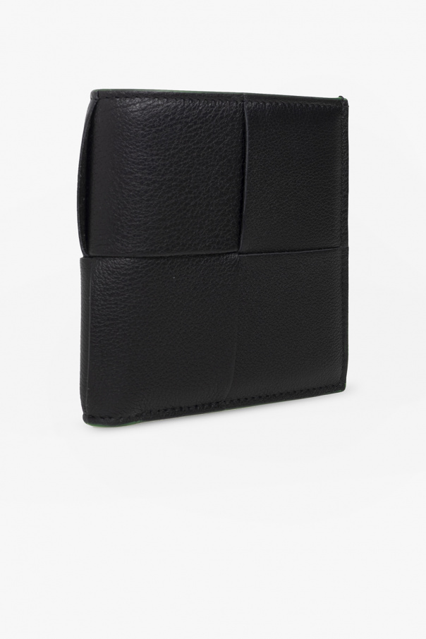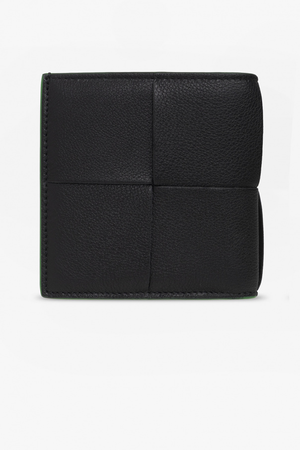 Black bi-fold wallet from Bottega Veneta. Made from calf leather and lamb leather with the brand's signature Intreccio weave, this item features green trims and a bill compartment and eight card slots inside.