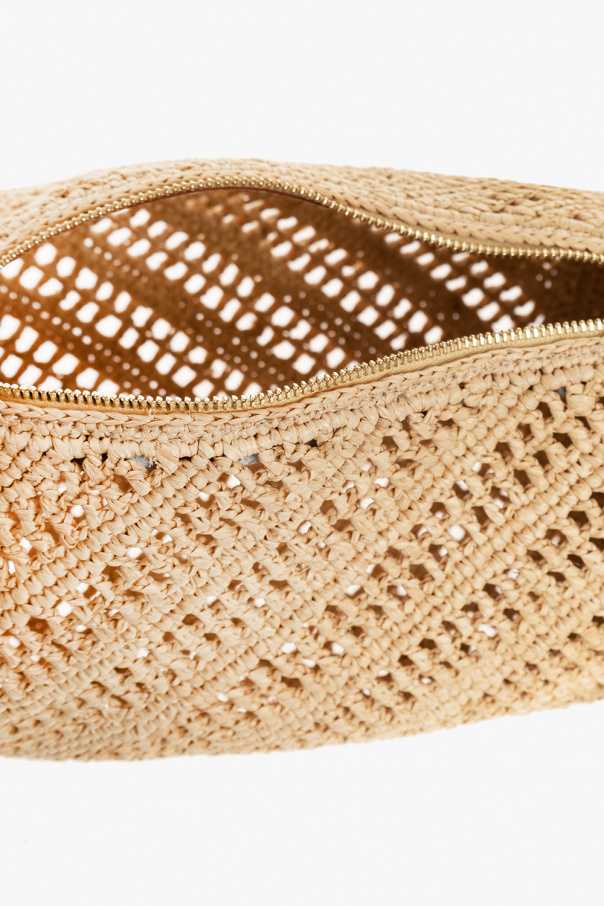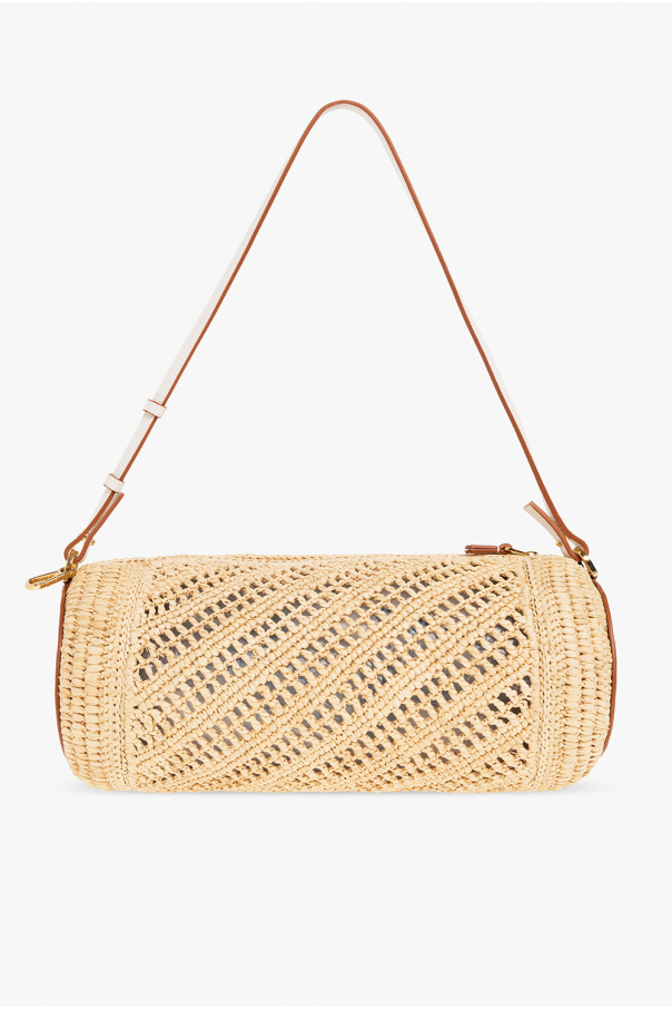 Beige and white ‘Bracelet’ shoulder bag from Loewe. Crafted from calf leather and woven raffia, this design features a zip fastening, an embossed logo on the side, a detachable and adjustable shoulder strap, a lobster clasp that concerts it into a bracelet, gold-tone metal hardware and one internal compartment.