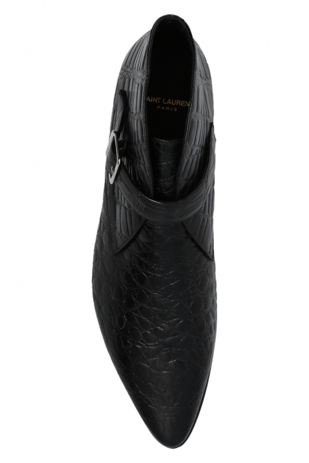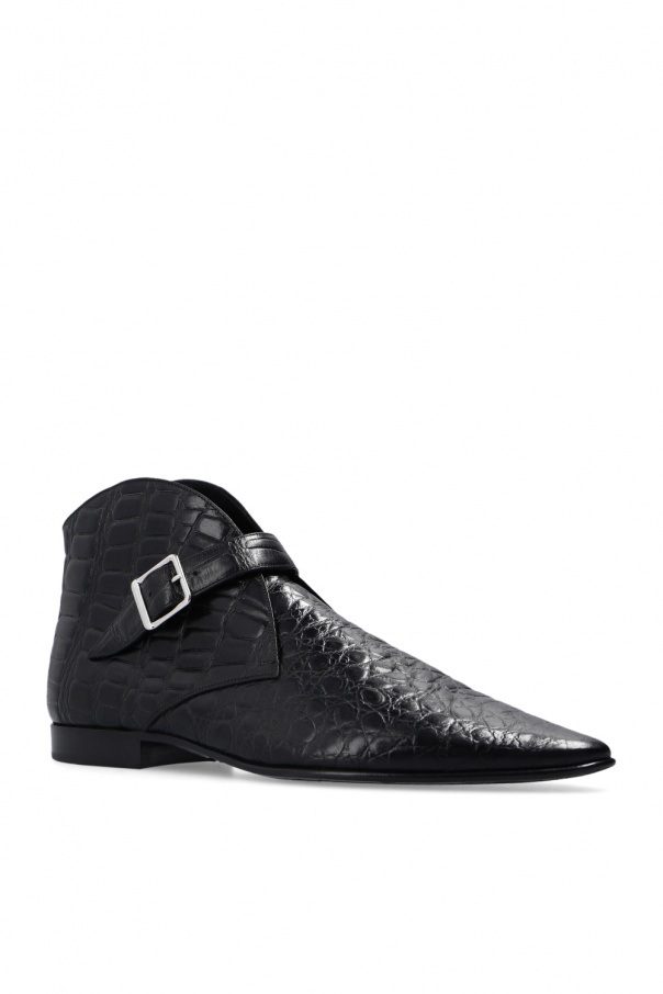 Black ‘Dixon’ ankle boots from Saint Laurent. Crafted from calf leather with a crocodile skin effect, this model showcases a pointed toe silhouette, a side strap closure with a metal buckle and a black leather sole.