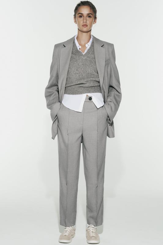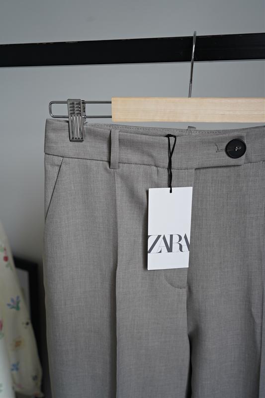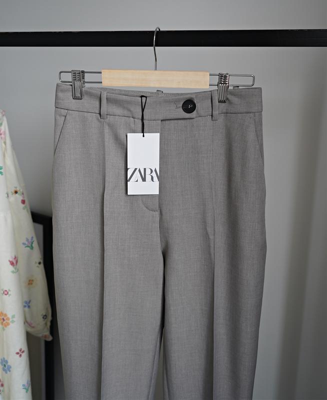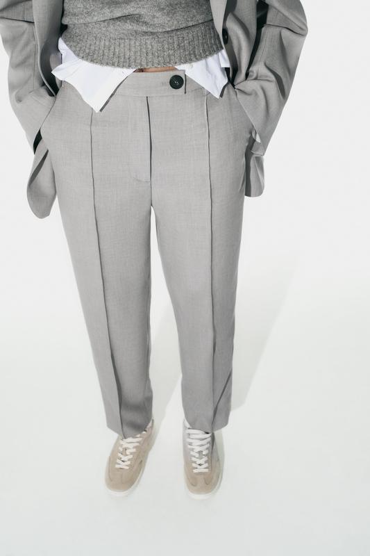 Брюки с завышенной талией и складками спереди. Передние карманы и задний ложный прорезной карман. Застежка на молнию и пуговицу спереди.