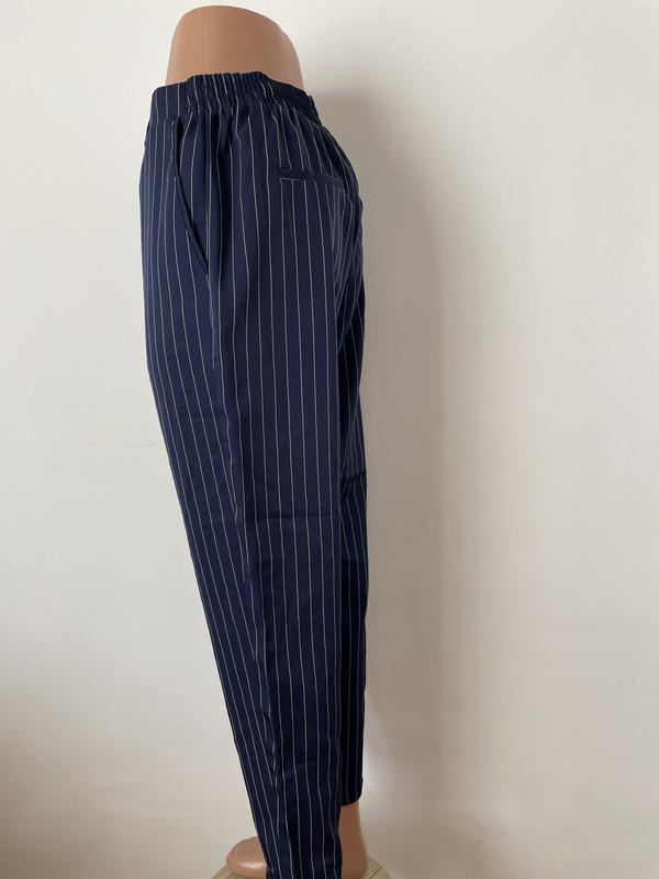 Стильные брюки темно-синего цвета в полоску , боковые карманы , сзади имитация карманов . Сзади пояс на резинке