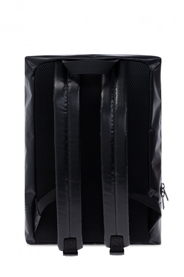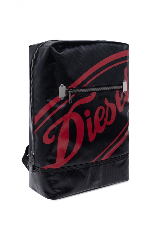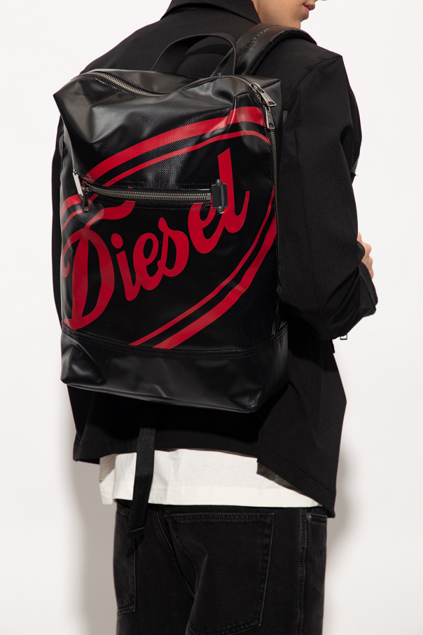 Black ‘Charly’ backpack from Diesel. Made of waterproof tarpaulin inspired by military protective clothing. Fastened with a two-way zip, this model features a red logo with a faded effect, front zip pocket, perforated layer at the back, half-round handle, two adjustable shoulder straps, antique silver-tone metal hardware and one internal compartment with a laptop compartment and three slip pockets.