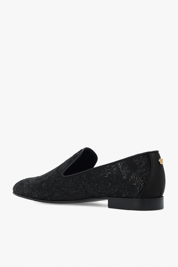 Black loafers from Versace. Made of satin encrusted with the ‘Barocco Silhouette’ sequins, this model features gold-tone Medusa hardware at the back and a black leather sole at the base.