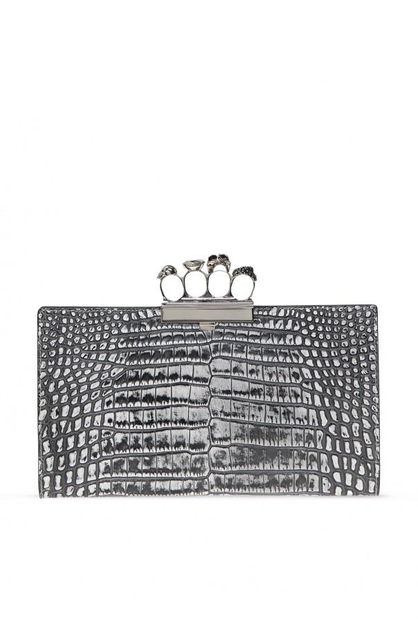 Grey and white 'Four-Ring' clutch from Alexander McQueen. Crafted from calf leather with a crocodile skin effect, this item fastens with a clasp and is complete with a ring handle decorated with Swarovski crystals in gold-tone and silver-tone brass hardware. It has one internal compartment lined with beige suede and two zip pockets.