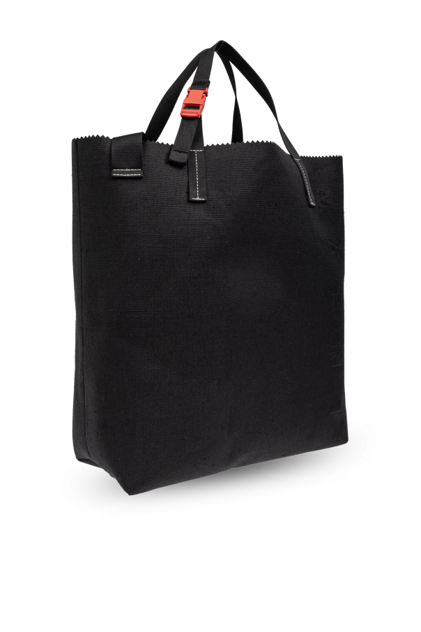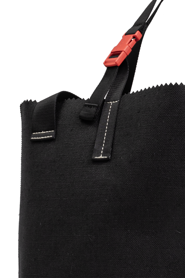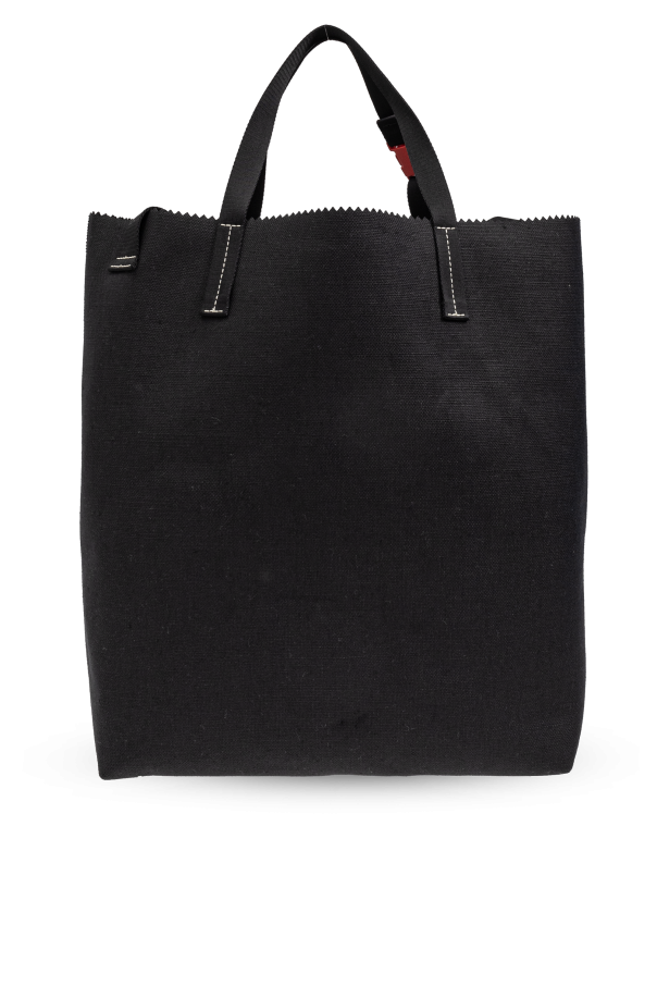 Introducing the quintessence of sophistication and functionality - the Shopper Bag by Marni. Crafted from premium, textured material, this black shopper bag epitomizes durability and high-quality craftsmanship. Its simple yet elegant design, characterized by vertical stitch lines, adds a dimension of structure, making it an exemplary accessory for the discerning fashion enthusiast. The classic, rectangular shape of this shopper offers capacious utility for daily endeavors, devoid of external pockets or zippers, showcasing a minimalist and sleek aesthetic. A distinctive feature is a small, red detail, perhaps an ornamental accent or part of the closure system, which lends a subtle yet impactful charm. Although the interior details remain a mystery from the images provided, the spacious compartment is hinted at, promising practicality alongside elegance. Adorned with discreet yet recognizable designer logos or inscriptions subtly embossed on the fabric, this bag stands as a testament to Marni's legacy of understated luxury. The long handles ensure comfortable shoulder wear, as demonstrated on a model, offering insights into the bag's size and how it gracefully complements the human silhouette. Why Purchase This Product? Exemplary craftsmanship and premium materials ensure longevity. Minimalist design with an elegant structure, suitable for various stylings. Spacious interior compartment for practical, everyday use. Subtle design elements and designer recognition lend an air of exclusivity.