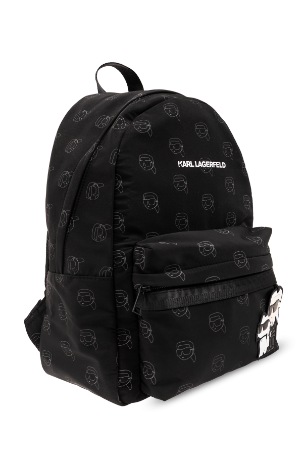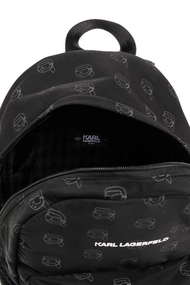 Black backpack from Karl Lagerfeld Kids. Fastened with a two-way zip, this model features a pattern, logo patch, zipped front pocket, half-round handle, adjustable shoulder strap, one internal compartment and black metal hardware.