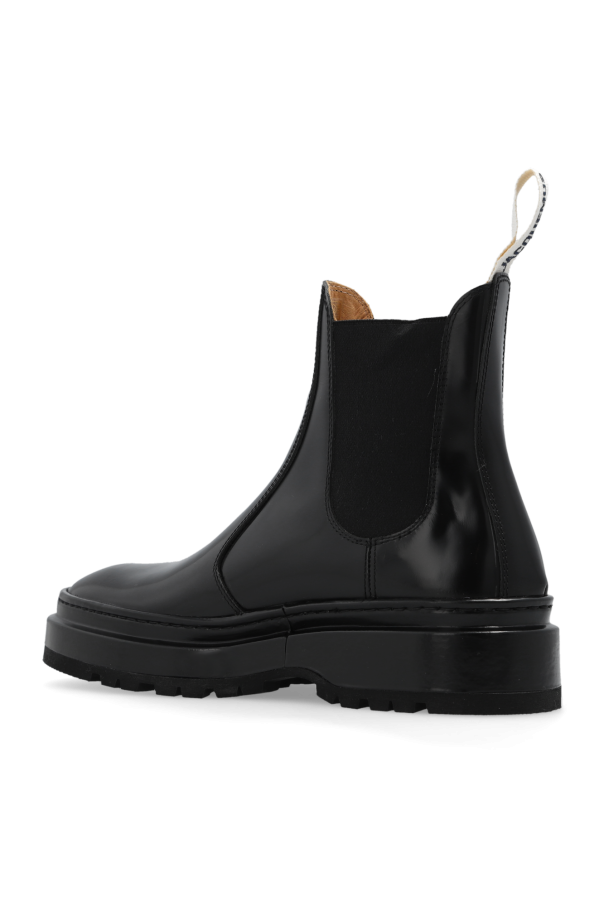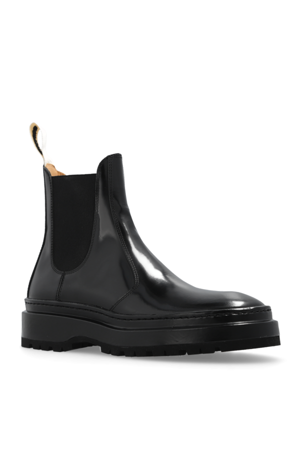 Black ‘Pavane’ Chelsea boots from Jacquemus. Made from leather, this model sits on a black rubber sole and features a cream pull tab with a logo on the back and elastic panels on the sides.