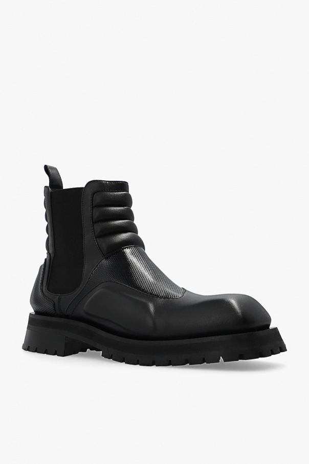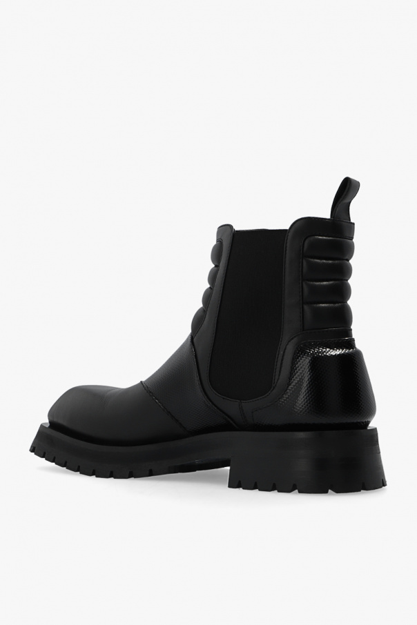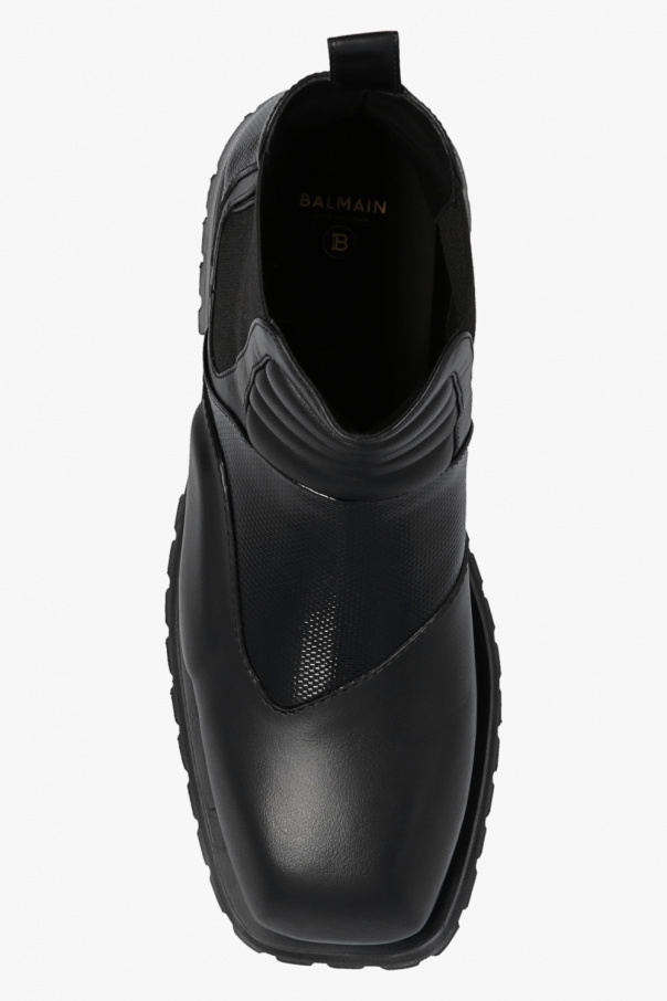 Black ‘Army’ shoes from Balmain. Made from leather, this model sits on a black rubber sole and features elastic panels on the sides, distinctive quilted details and a varnished, textured insert.