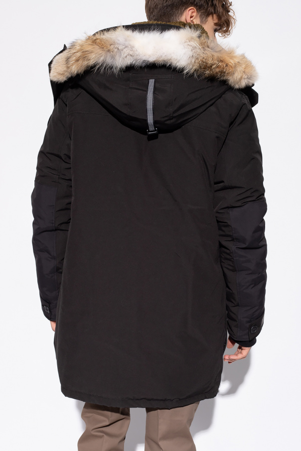 Black ‘Sherridon’ parka from Canada Goose. Fastened with a zip and snap closure, garment features a grey and black logo patch, four snap-fastened pockets, drawstring hood, long sleeves with ribbed cuffs and a hood trimmed with beige and brown fur.