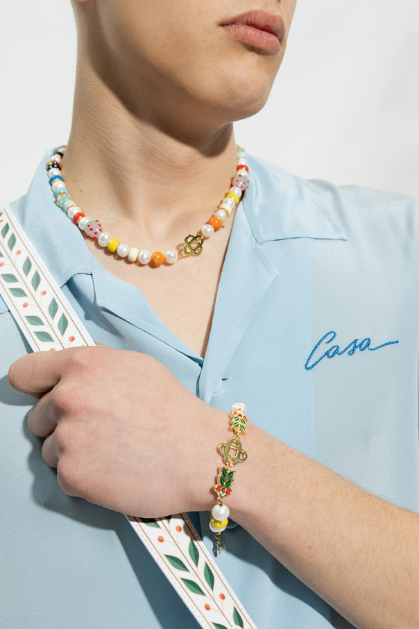 Gold-tone bracelet from Casablanca. Crafted from gold-plated brass and trimmed with faux pearls, this item adjusts via a lobster clasp and features a logo-shaped pendant, a motif of laurel leaves , mushrooms and tennis balls covered with colourful enamel.