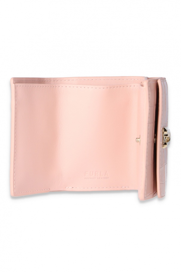 Pink wallet from Furla. Crafted from leather with a crocodile skin effect, this item features snap fastenings and a gold-tone logo detail as well as one coin pocket, one bill compartment and three card slots inside.