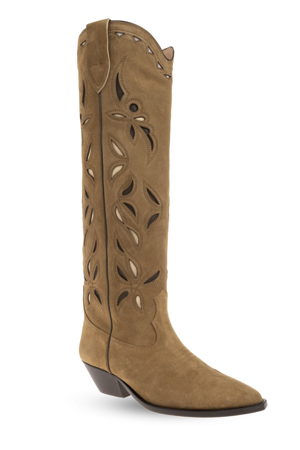 Khaki ‘Denvee’ heeled boots from Isabel Marant. This pair features cut-outs with a pattern in black and cream leather, pointed toe and beige leather sole.