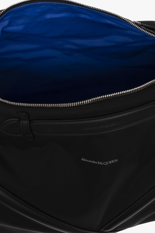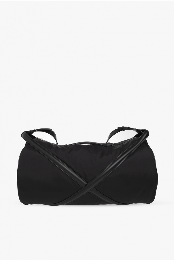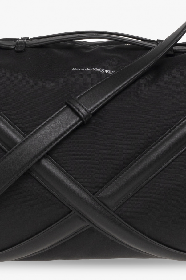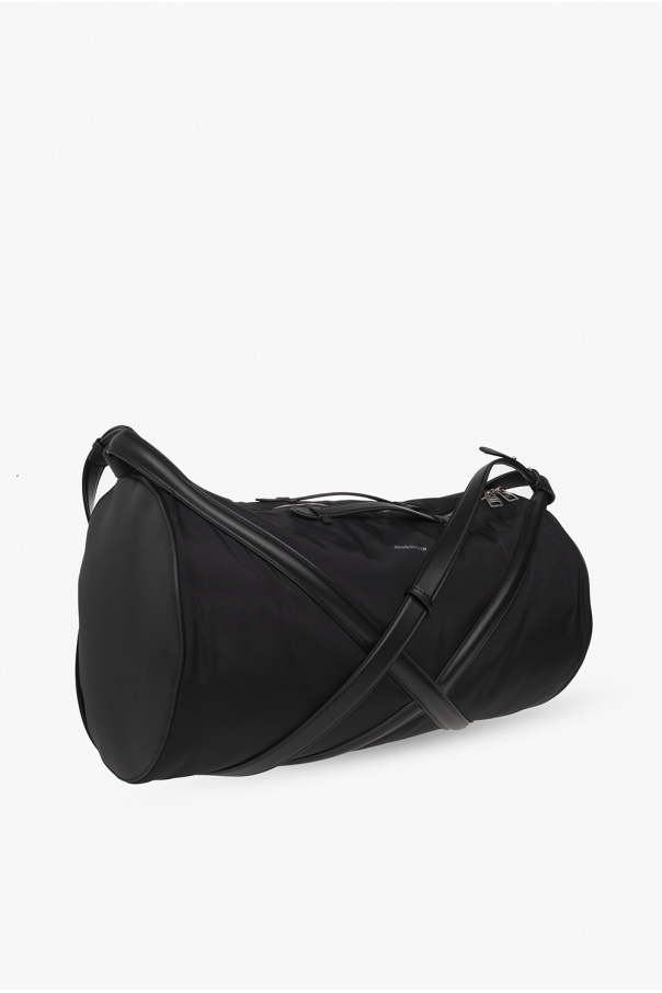 Black ‘The Harness’ duffel bag from Alexander McQueen. Crafted from fabric and trimmed with leather, this design features a two-way zip fastening, crisscross harness detailing, a logo print on the front, two handles, a detachable and adjustable shoulder strap, silver-tone metal hardware and one internal compartment with two slip pockets.