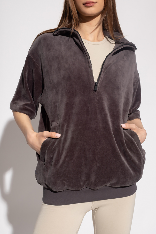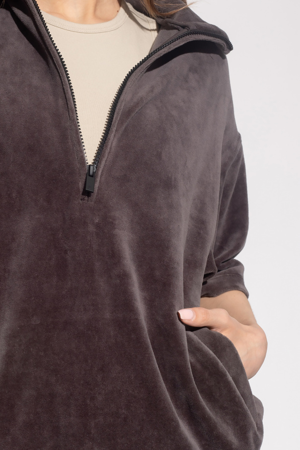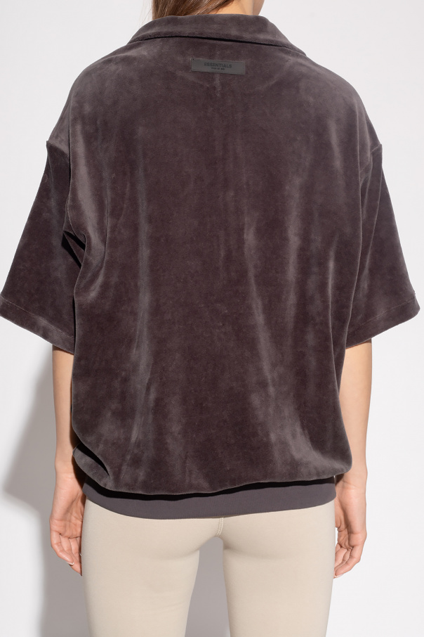 Dark grey sweatshirt with a standing collar from Fear Of God Essentials. Rendered in velour with a relaxed silhouette, this style features a quarter zip closure, two front slip pockets, a rubber logo patch at the back and an elasticated bottom hem.