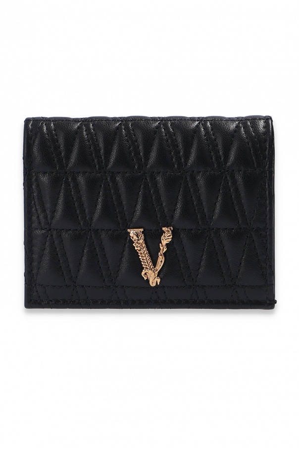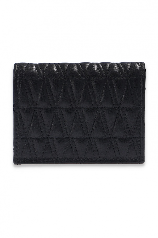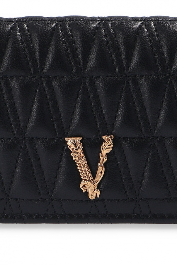 Black quilted wallet from Versace. Crafted from leather, this accessory fastens via snap-button and showcases logo plaque for the brand recognition. It is complete with gold-tone metal fittings and interior clad in yellow floral print, which employs four card slots, two slip pockets, one zip pocket and a bill compartment.