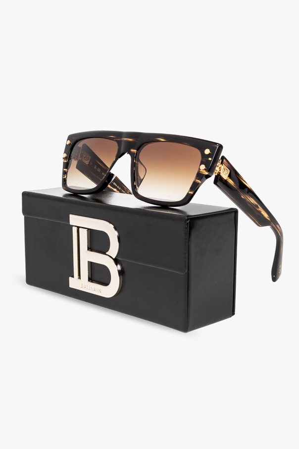 Brown ‘B-III’ sunglasses from Balmain. Embellished with a transparent pattern, this model features rectangular framework with a single bridge, integrated nose pads, decorative gold-tone hinges and brown gradient lenses with 100% UV protection.