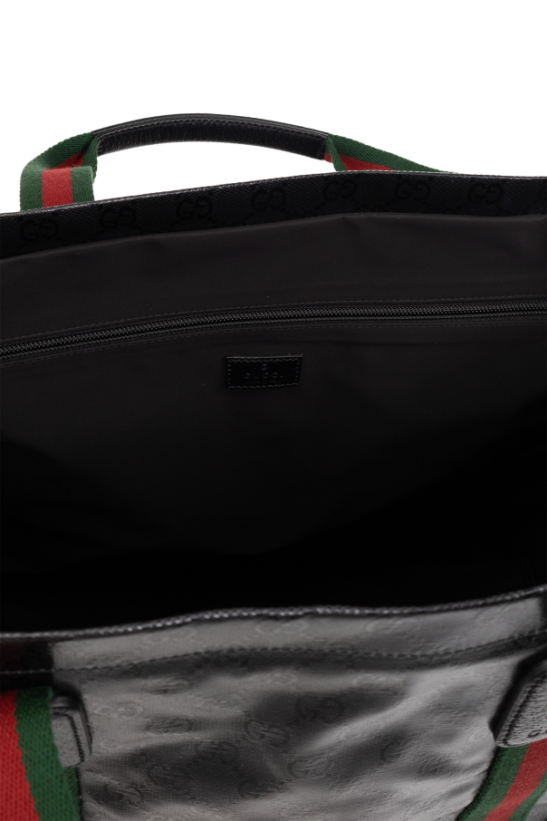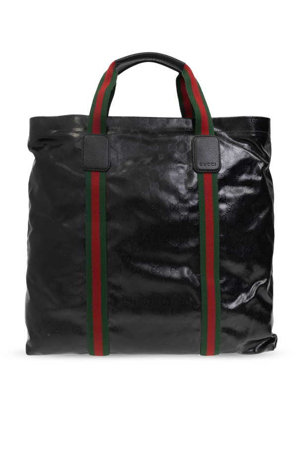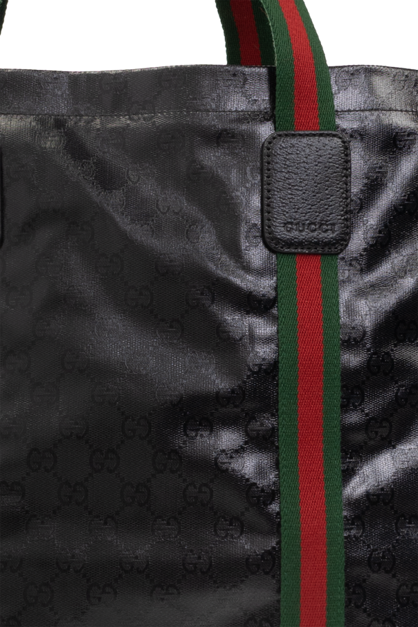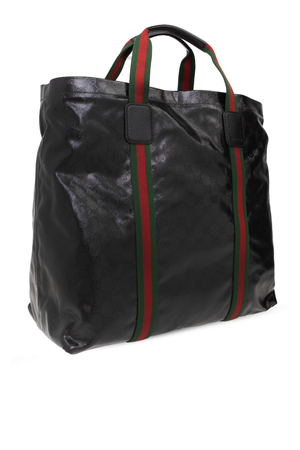 Black shopper bag from Gucci. Size medium. Made of ‘GG Crystal’ canvas trimmed with leather, this design features the brand's signature green-red-green ‘Web’ stripe, embossed logo, two half-round handles and one internal compartment with one zip pocket.