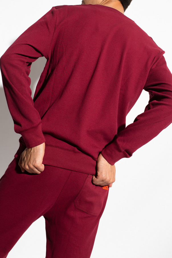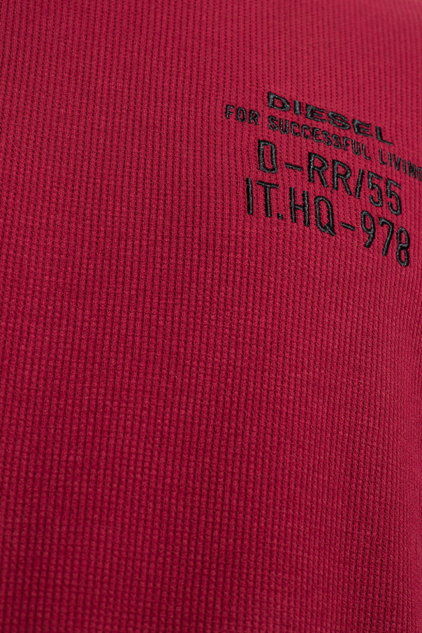 Maroon crewneck T-shirt from Diesel. Made of cotton, this garment features an embroidered logo pattern in black and ribbed trims at the neck, hem and cuffs.