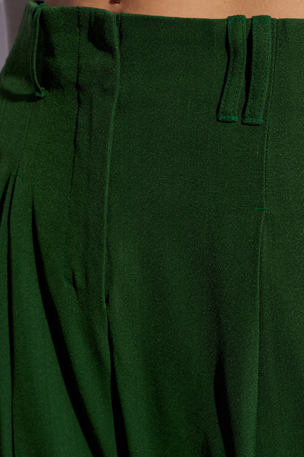 Introducing 'Titolo', a pair of trousers that redefine the essence of classic sophistication. Crafted by the renowned designer Jacquemus, these trousers exude an air of elegance and refined taste. The vibrant green hue captivates the eye, while the traditional, sleek design with pronounced creases along the legs injects a dose of formal allure. Constructed from a luxurious blend of materials, including viscose and silk, the 'Titolo' trousers boast a textured appearance, highlighted by subtle vertical stripes that speak volumes of their high-quality craftsmanship. The absence of external branding underscores Jacquemus's commitment to minimalist design and attention to detail, allowing the exquisite fabric and impeccable cut to take center stage. The trousers feature a standard zipper and button closure, belt loops, and a modern silhouette that tapers slightly towards the bottom, offering a contemporary twist on a timeless style. The model, standing at 176cm with measurements of 85cm bust, 60cm waist, and 89cm hips, wears a size 36, showcasing the trousers' flattering fit and versatile appeal. Why Purchase 'Titolo' Trousers? Elegant Design: Classic cut with a modern twist, perfect for formal and casual settings alike. Exquisite Material: A sumptuous blend of viscose and silk ensures comfort and durability. Attention to Detail: Minimalist aesthetic with subtle texturing and vertical stripes for an understated yet sophisticated look. Versatile and Flattering: Tapered fit designed to complement various body types, enhancing the wearer's silhouette.