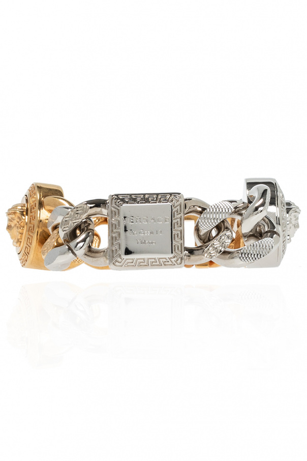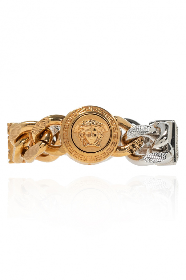 Gold-tone and silver-tone bracelet from Versace. Fastened with a snap, this item showcases appliqués with the signature Medusa head.