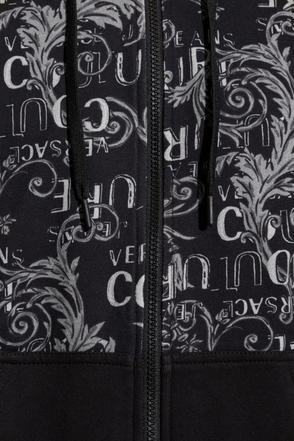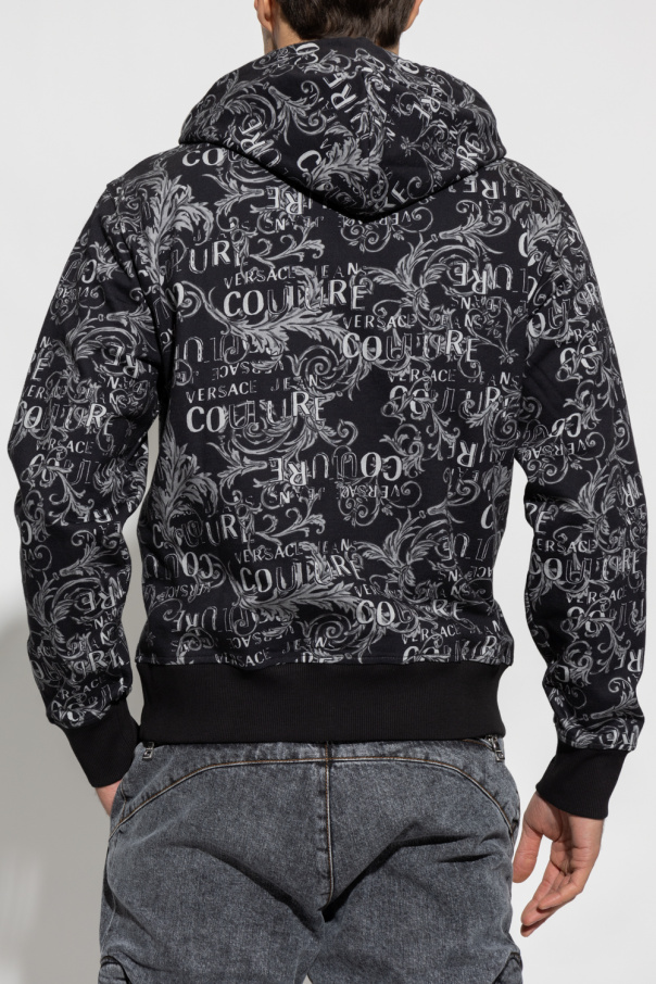 Black sweatshirt with a drawcord-adjustable hood from Versace Jeans Couture. Crafted from cotton, this style features the brand's signature 'Logo Couture' motif in grey, a zip fastening, two slip pockets and long sleeves with elasticated cuffs.