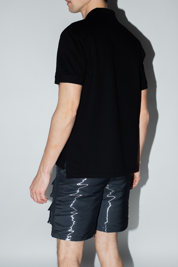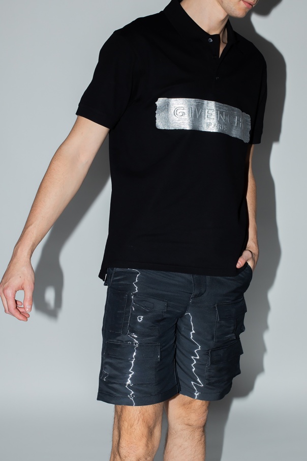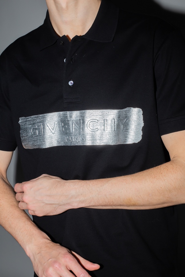 Black polo shirt from Givenchy. Flaunting a silver-tone logo print, this cotton-crafted style fastens via buttons and features short sleeves and side slits.