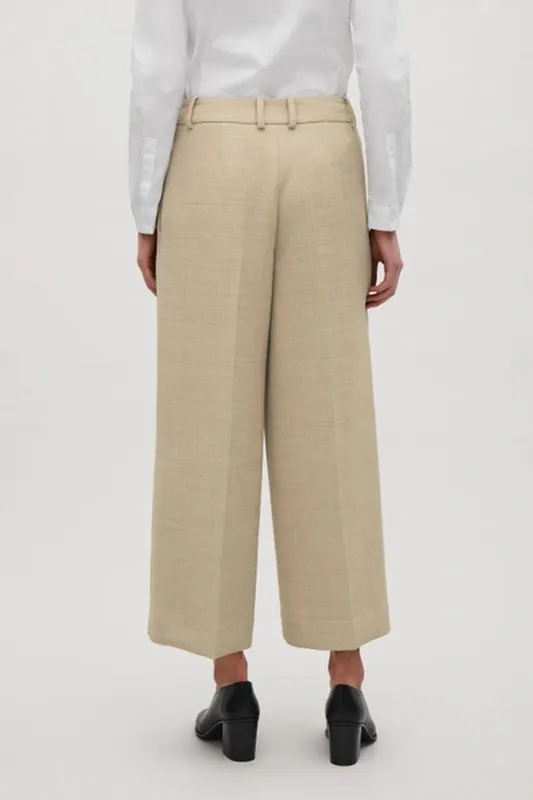 Кюлоты COS из смесовой шерсти бежевого цвета с вкраплениями, максимально показывает фото 6. Оригинальный пояс со шлевками. Застёгиваются спереди на молнию, пуговичку и крючок. Спереди два косых боковых кармана. Длина с поясом 89,5см, полуобхват пояса 39см, поб 53см, посадка 30см/39см, длина по шаговому шву 62,5см, полуобхват брючины внизу 31,5см. Все замеры по верху изделия в разложеном ( не от шва до шва), застегнутом, нерастянутрм виде. Размер S-M.