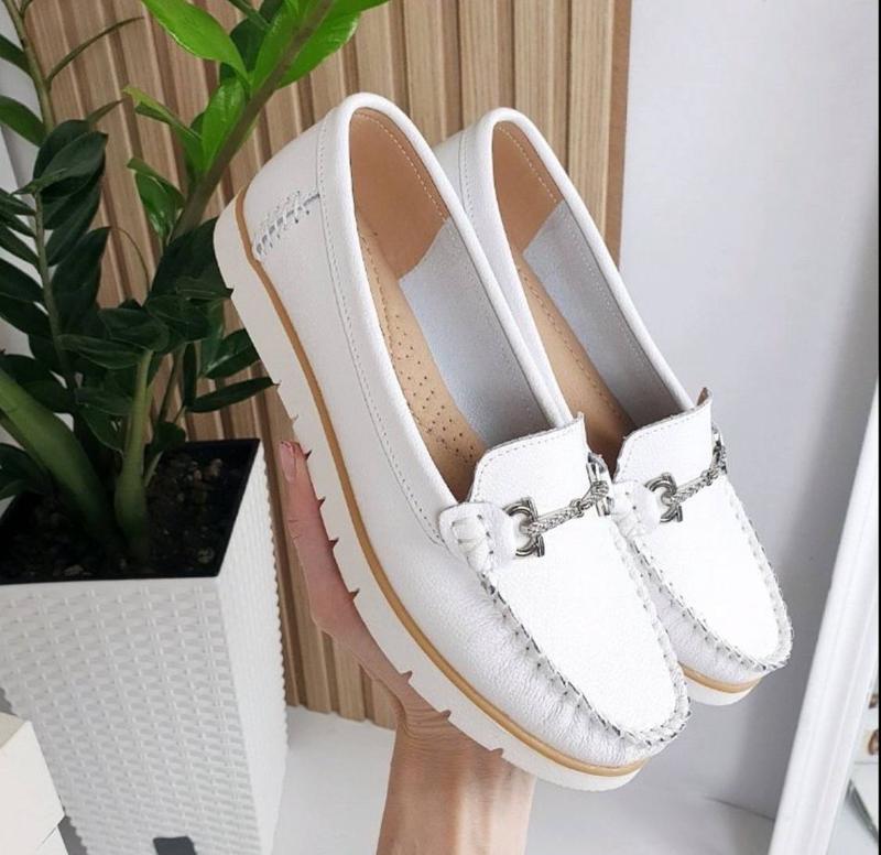 Белые лоферы из натуральной кожи с серебряной пряжкой.