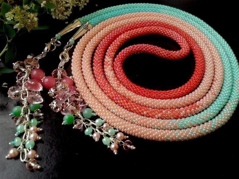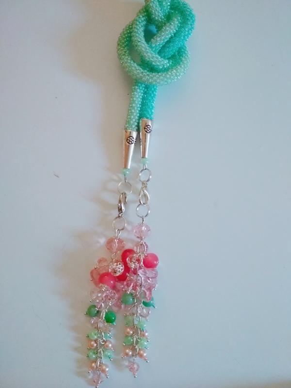 Ларіат з чеського якісного бісеру, зв′язаний на хлопковій нитці. Відтінкі бісеру ніжного м′ятного та рожевих кольорів нагадують кольори весняного квітучого саду. Довжина джгута 180 см, підвіски по 8 см. Для підвісок використані сколи рожевого кварцу та скляні чеські намистини, якісна фурнітура. Підвіски відстібуються. Ларіат можна заплітати у косу, робити різні вузли і таким чином кожного разу створювати новий образ, виглядати стильно і яскраво. Ларіат також буде гарним подарунком для жінкі будь-якого віку. Для покупців ларіатів я висилаю детальну інструкцію як зав′язувати та носити ларіати. Доставка новой почтой за счет получателя после предоплаты на карту ПБ, также возможна оплата наложенным платежом.