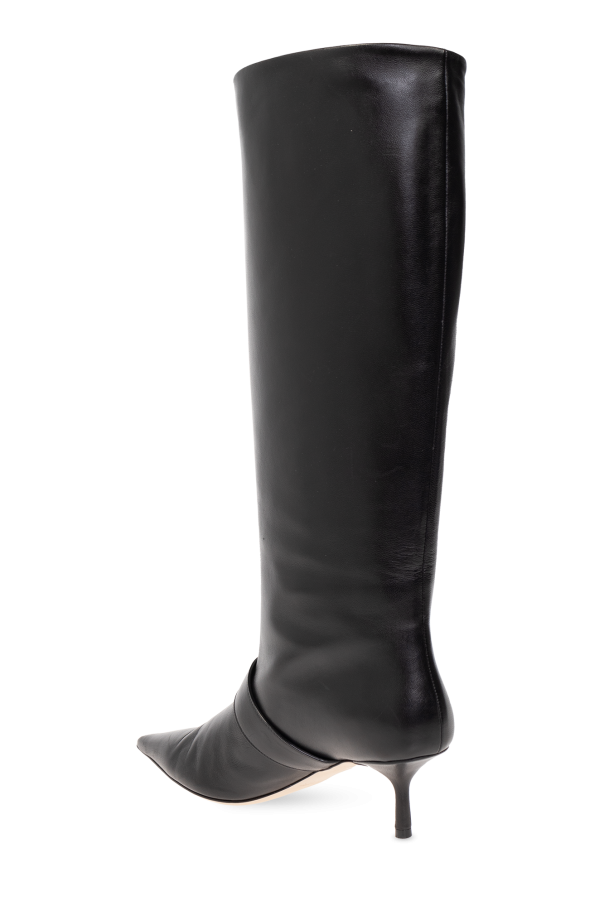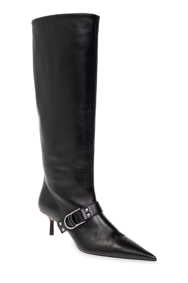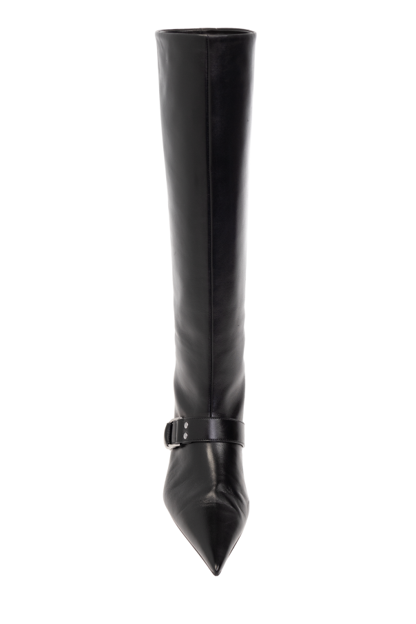 Black ‘Jeannie’ heeled boots from Blumarine. Made of leather, this pair sits on a beige leather sole and features a strap with a silver-tone metal buckle and a pointed toe.