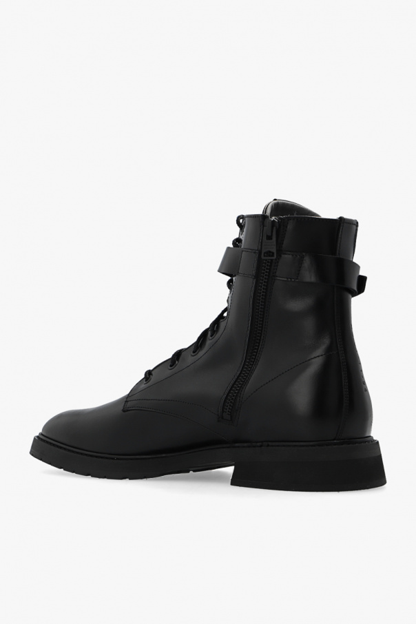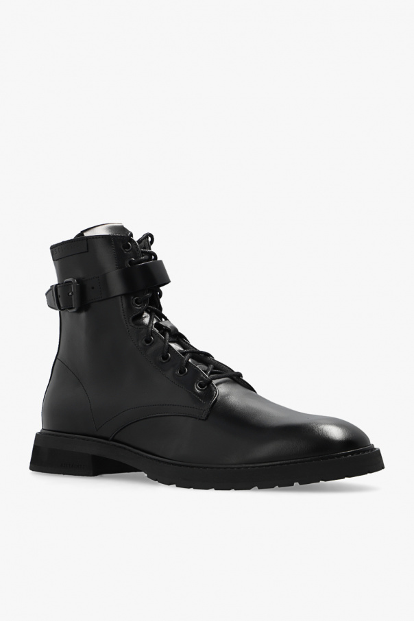 Black ‘Porter’ ankle boots from AllSaints. Crafted from smooth leather, this lace-up model sits on a black rubber sole and features logo detailing, a side zipper and a buckle strap.