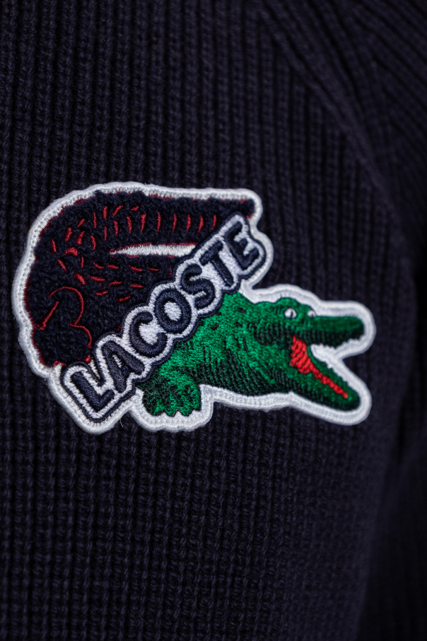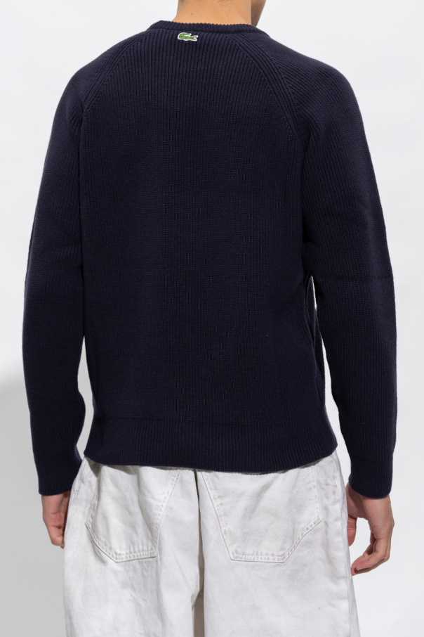 Navy sweater with a round neck from Lacoste. Crafted from wool from sustainable sources, this long sleeve garment is enriched by multicolored logo patches on the front and back as well as ribbed edges.
