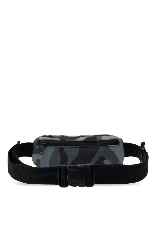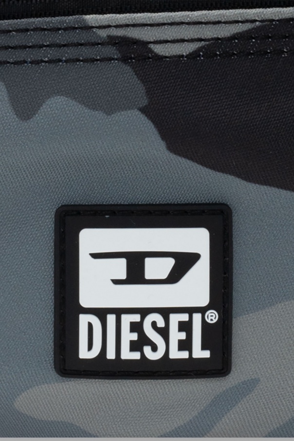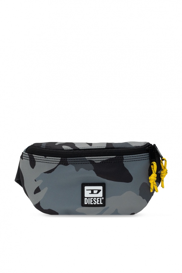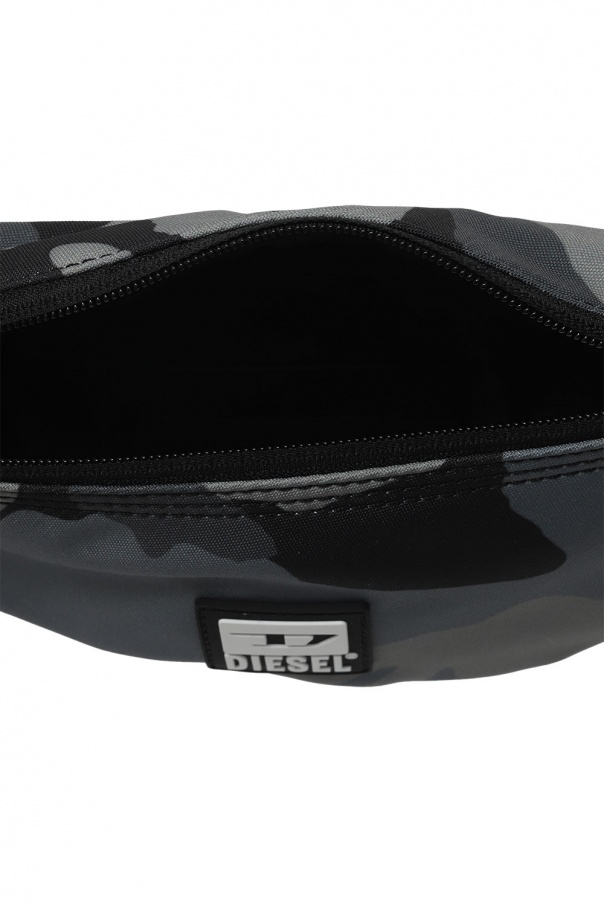 Black, green and grey belt bag from Diesel. Fastened with a two-way zip, this design features a camo pattern, rubber patch with a white logo, back zip pocket, adjustable belt and one internal compartment with one zip pocket and one card slot.