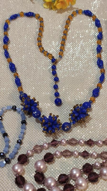 Гортайте карусель фото.Ціни на фото.Ціна за голубі кубики.Чудові,вінтажні намиста,з аметистового,сатинового,кобальтового скла.1)Намисто дворядне, з чеськими, штучними,акриловими перлинами з рожевим відтінком,в оточенні аметистового,та рожевого скла.Має довжину-73 см.,67 см.Дуже гарне,рідкісне намисто.2)Намисто однорядне,з чудового,рідкісного кольору- кобальтового,та жовтого скла.Круглі намистини у центрі,мають вигляд по типу муранських,дуже старенькі,фольговані всередині.Намисто має,деякі сліди часу.Довжина-64 см.+5 подовжувач.3)Буси з невеликих,сатинових кубиків.Буси виглядають,дуже витончено,ніжно.Довжина бус-77 см.