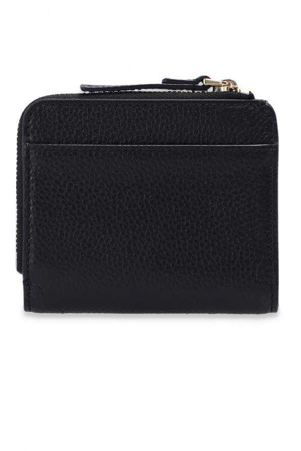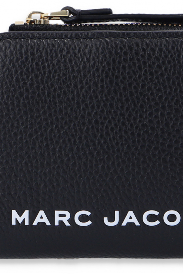 Black wallet from Marc Jacobs. Made of cow leather, this item secures with a zipper and snap and features a white logo pattern, gold-tone metal hardware and an interior with six card slots, a coin pocket and a bill compartment.