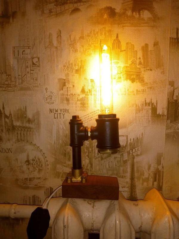 Данный светильник отлично дополнит и создаст уютную ламповую атмосферу прошлого века в вашем помещении. Интенсивность свечения лампы (лампа Эдисона имеет множество спиралей, что делает ее свечение более мягким, теплым и приятным для глаз) можно регулировать с помощью диммера от почти еле видного до максимального. Данный светильник выполнен из аутентичных сантехнических фиттингов - латунь + чугун. Основание - сосна, покрытая морилкой под ольху. Светильник имеет компактные размеры и легко поместиться даже на маленьком столике.