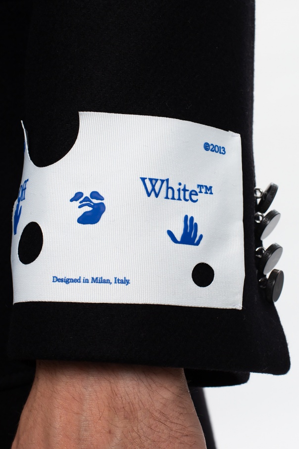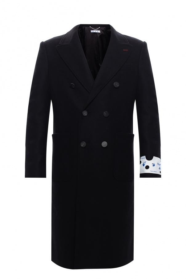 Black coat from Off-White. Crafted from wool, this double-breasted design fastens via buttons and employs two slit pockets on the front, a single vent on the back and long sleeves – one of the includes a patch with the label's logo.