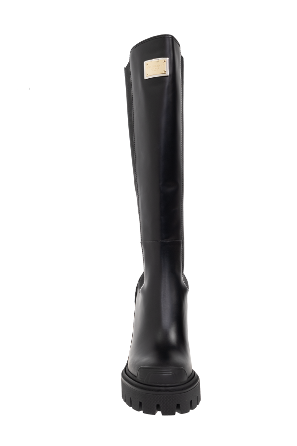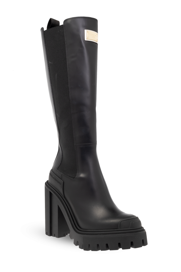 Black heeled boots from Dolce & Gabbana. Made of smooth leather, this pair features a logo-engraved square detail in gold- and silver-tone, elastic side panels and black rubber sole.