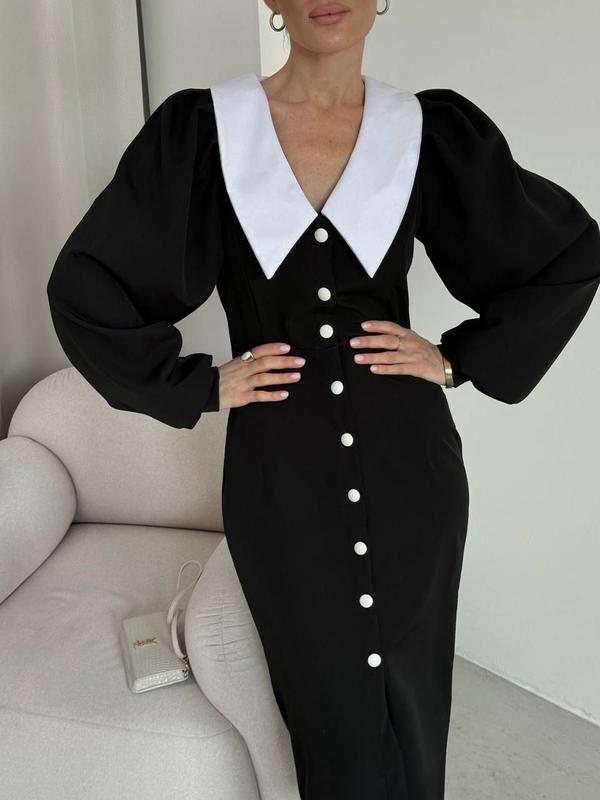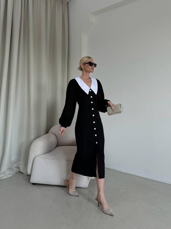 ▪️Розмір: 42-44 та 44-46Сукні з білим комірцем не втрачають своєї актуальності. Класичного темпераменту моделі надає чорний колір. Завершують образ декоративний комір і білі ґудзики . Чорний колір підходить для будь-якого сезону. А чорна сукня - це завжди найкращий вибір для будь-якого заходу.