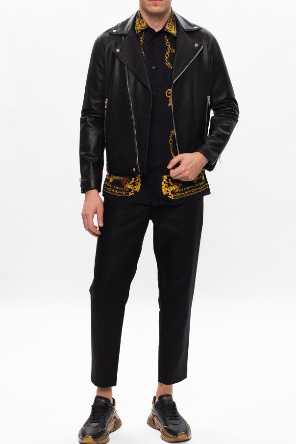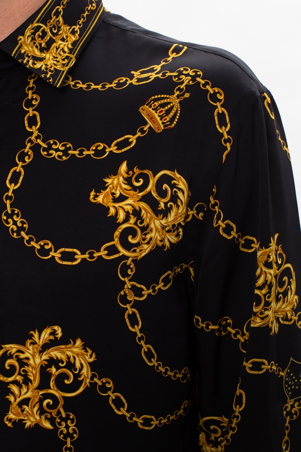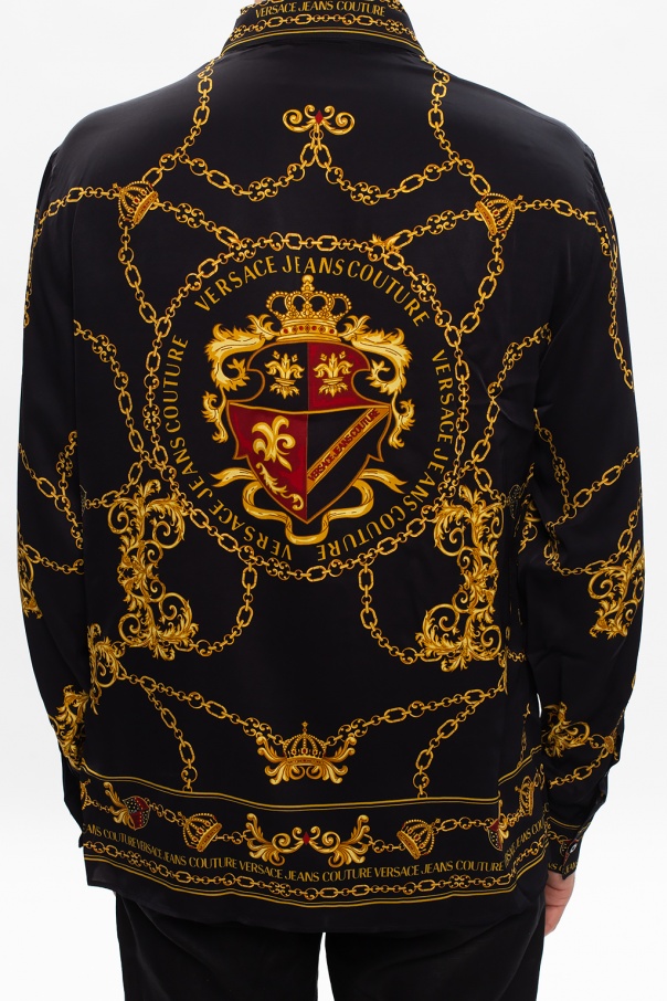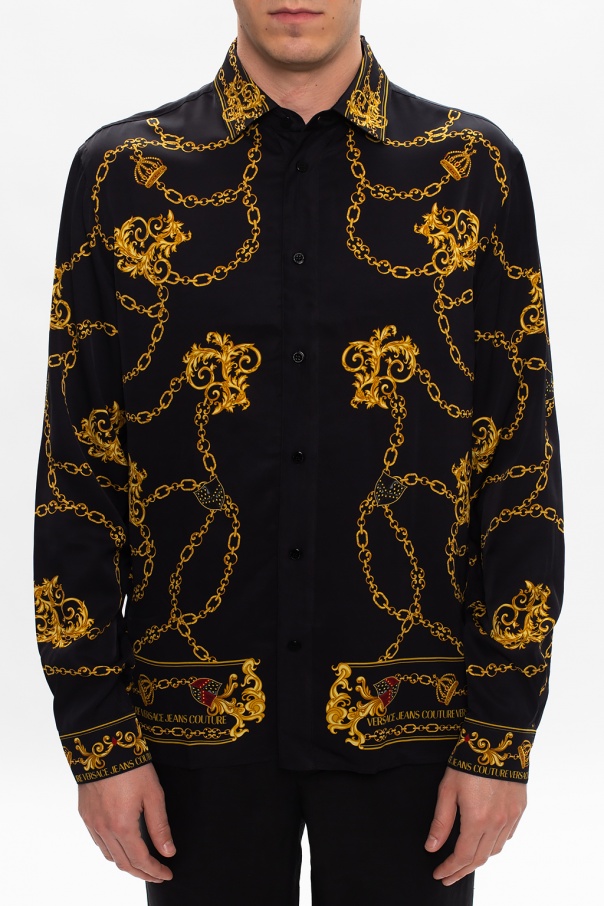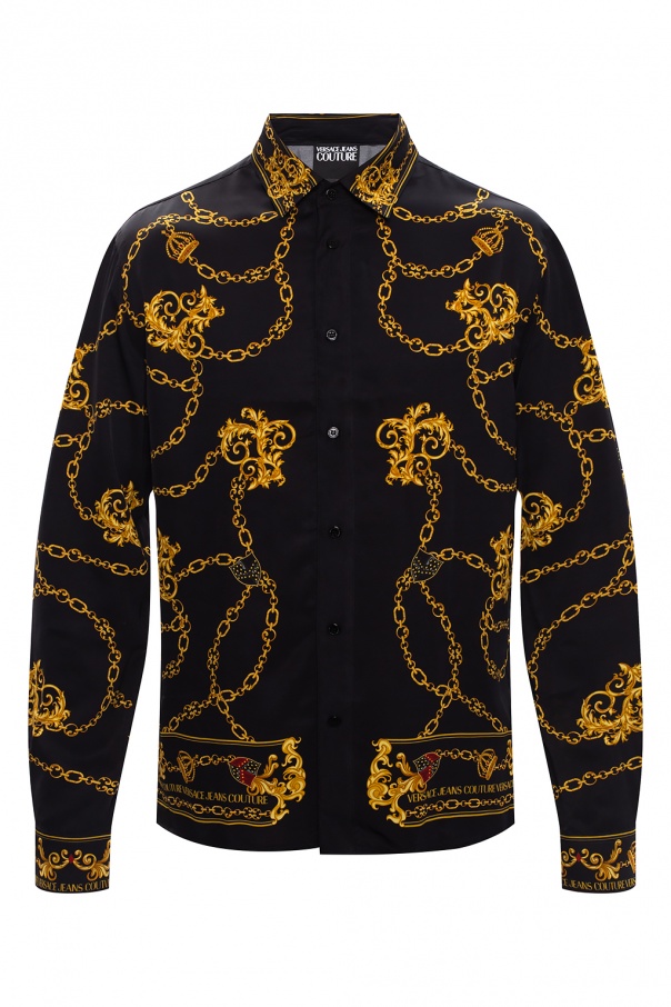 Black shirt from Versace Jeans Couture. Illustrated with yellow graphic print, this long-sleeved garment fastens via buttons and features button-fastened cuffs.