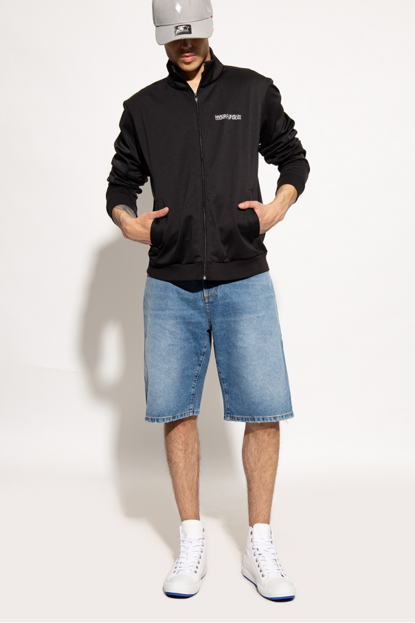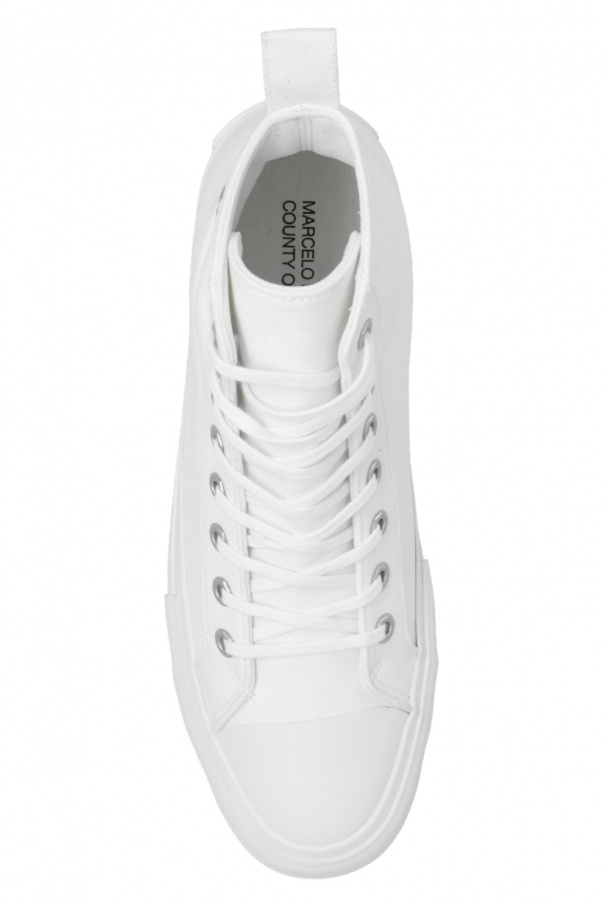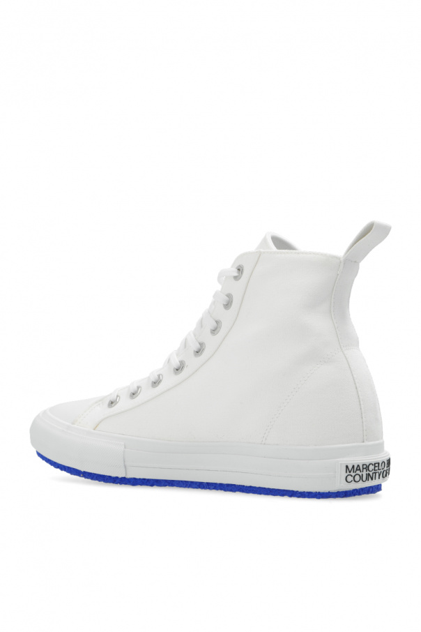 White high-top sneakers from Marcelo Burlon. Made of cotton, this lace-up pair features a mutlicolored logo embroidery on the side and rubber sole with a raised logo in white and blue.