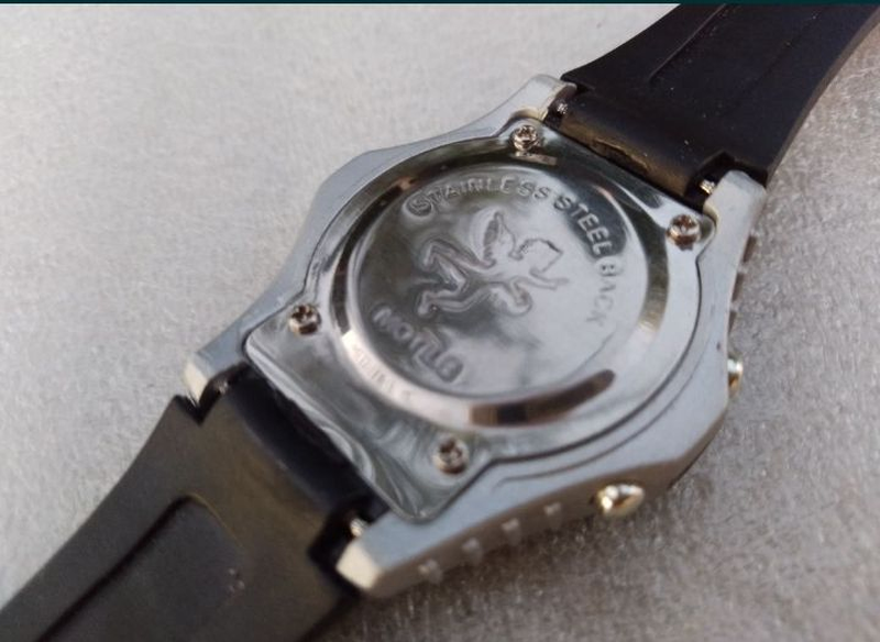 Корпус часов из ударопрочного пластика черного цвета с задней крышкой из нержавеющей стали. Ремешок из мягкого каучука с металлической застежкой.