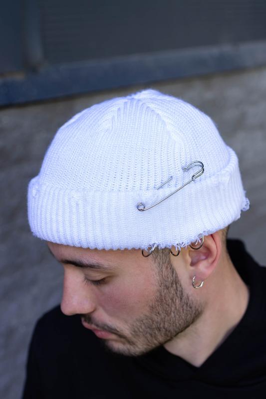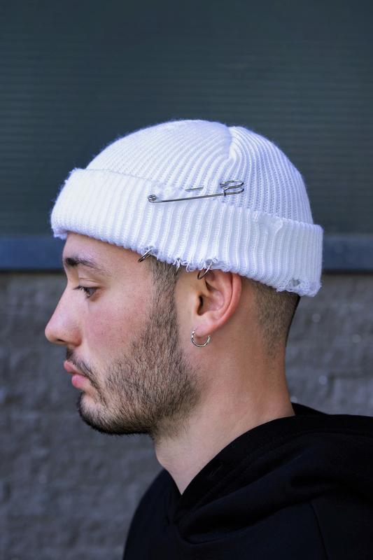 ▪️Шапка выполнена с дизайнерскими повреждениями и дополнительными съемными элементами в виде колец и шпильки.