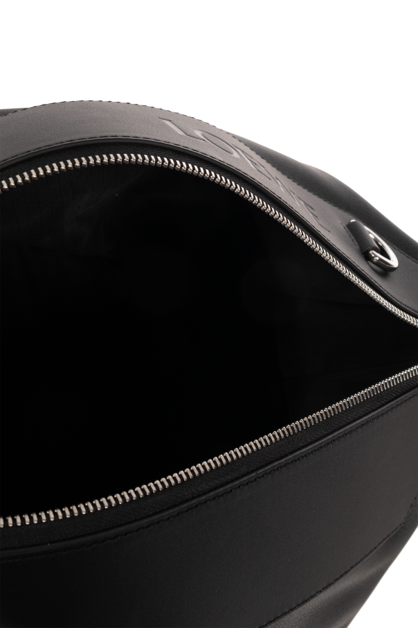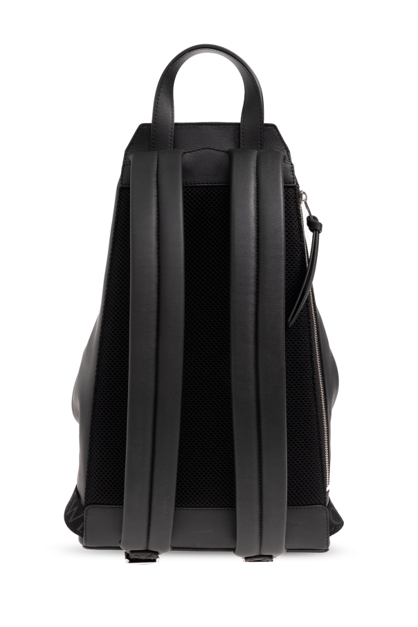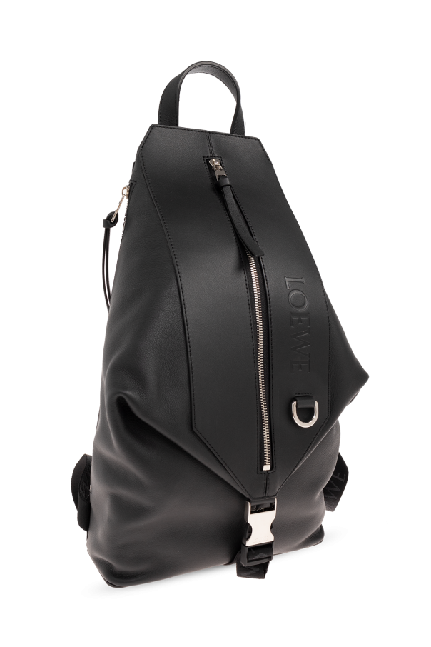 Black backpack from Loewe. Made from calf leather, this item fastens via a zip and snap and showcases an embossed logo, one top handle, adjustable shoulder straps accompanied by a zip pocket on the back, silver-tone metal hardware and one internal compartment.