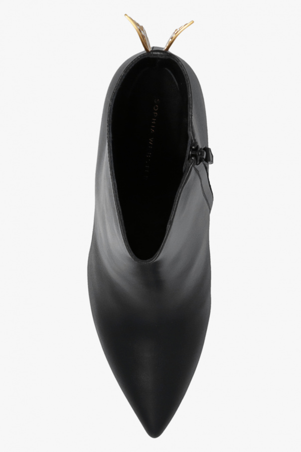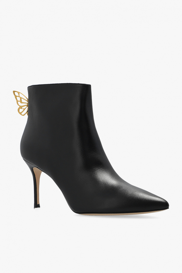 Black ‘Mariposa’ stiletto ankle boots from Sophia Webster. Crafted from leather, this pair features a side zip, the brand’s signature gold-tone metal butterfly appliqué at the back, pointed toe and beige leather sole.