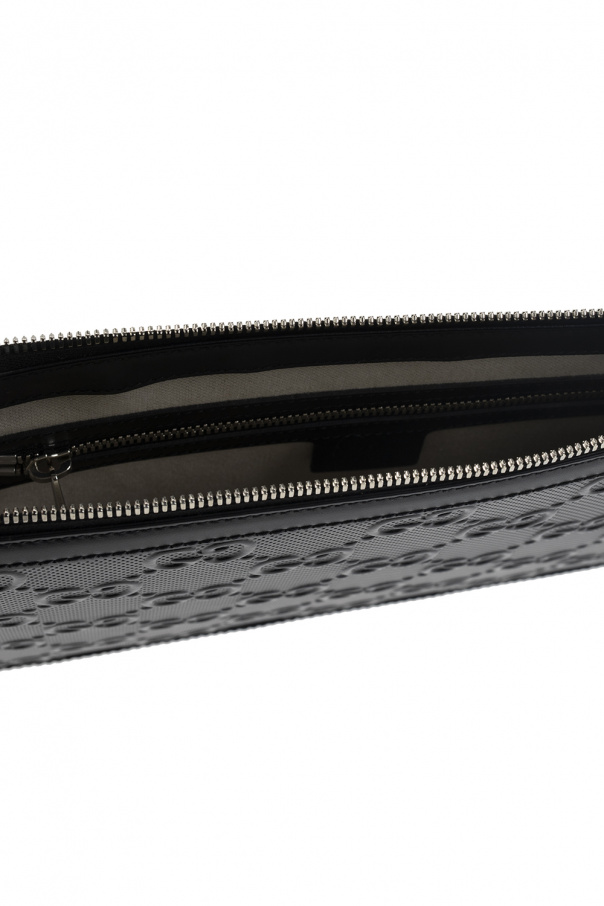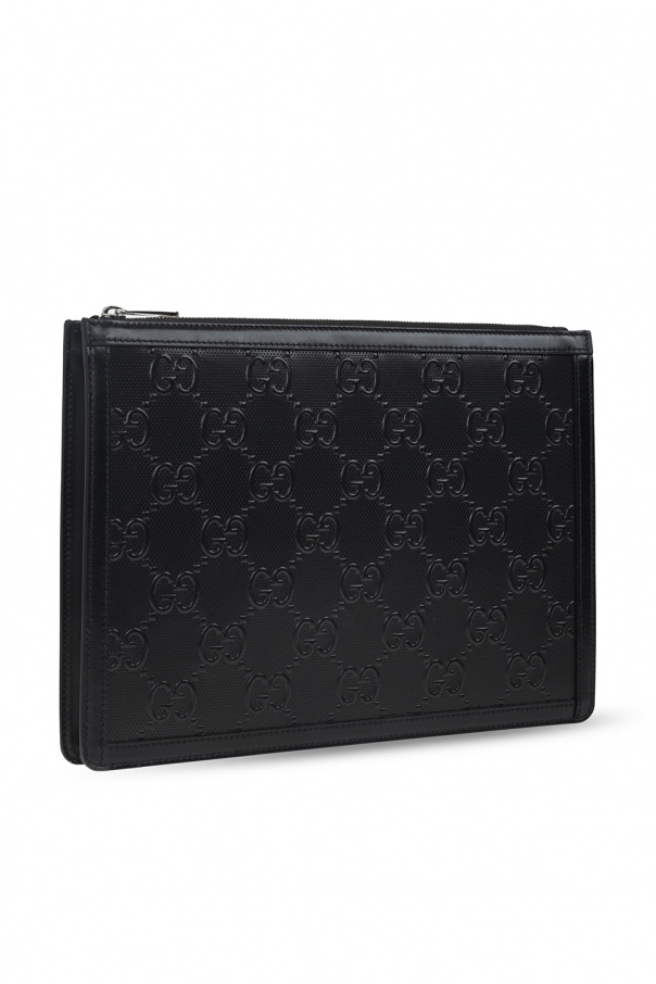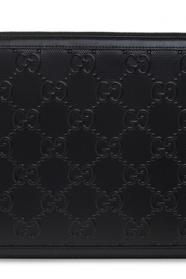 Black ‘GG’ pouch from Gucci. Crafted from leather, this design fastens via a zip and showcases an embossed logo pattern. It is complete with silver-tone metal hardware and a cream cotton-clad interior with one compartment, two slip pockets and one zip pocket.