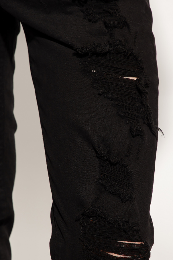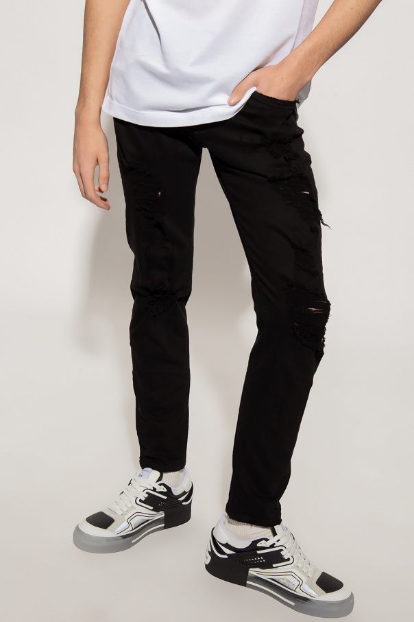 Black slim fit jeans from Dolce & Gabbana. Fastened with a button and zip closure, this pair features a black and gold-tone logo appliqué, three front pockets and two back pockets.