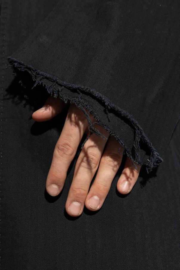 Introducing the quintessence of avant-garde elegance: the Black Hooded Coat from the distinguished house of Balenciaga. Crafted with an exquisite attention to texture and form, this coat merges the timeless allure of black with the tactile sophistication of materials reminiscent of corduroy, presenting a visual and sensory delight. The garment\'s silhouette is a study in the art of tailoring, featuring a sleek, tapered design that flows seamlessly from the hood down to the meticulously unhemmed cuffs, embodying a deconstructivist aesthetic that is both intentional and striking. The absence of front closures accentuates its streamlined profile, allowing the coat to drape effortlessly, while the inclusion of flat flap pockets adds a layer of functional elegance. Made from a blend of cotton and viscose, this coat stands as a testament to Balenciaga\'s commitment to blending luxury with practicality. Its distinctive texture and the stark, unadorned finish serve to highlight the brand\'s prowess in creating pieces that are both innovative and understated. Why choose this product? Exclusive Design: A unique piece from Balenciaga, showcasing minimalist charm with unconventional details. High-Quality Materials: A luxurious combination of cotton and viscose ensures comfort and durability. Practical Features: Equipped with button closure and two practical flap pockets, blending functionality with high fashion. Unparalleled Style: The coat\'s deconstructivist elements and sophisticated texture make it a standout addition to any wardrobe.